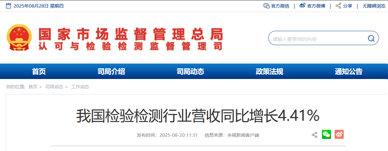 • 2025-08-28 我國檢驗檢測行業營收同比增長4.41%